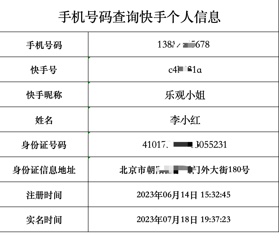 即知道快手号,查出此号的身份证正面信息。包括姓名,身份证号,身份证地址。